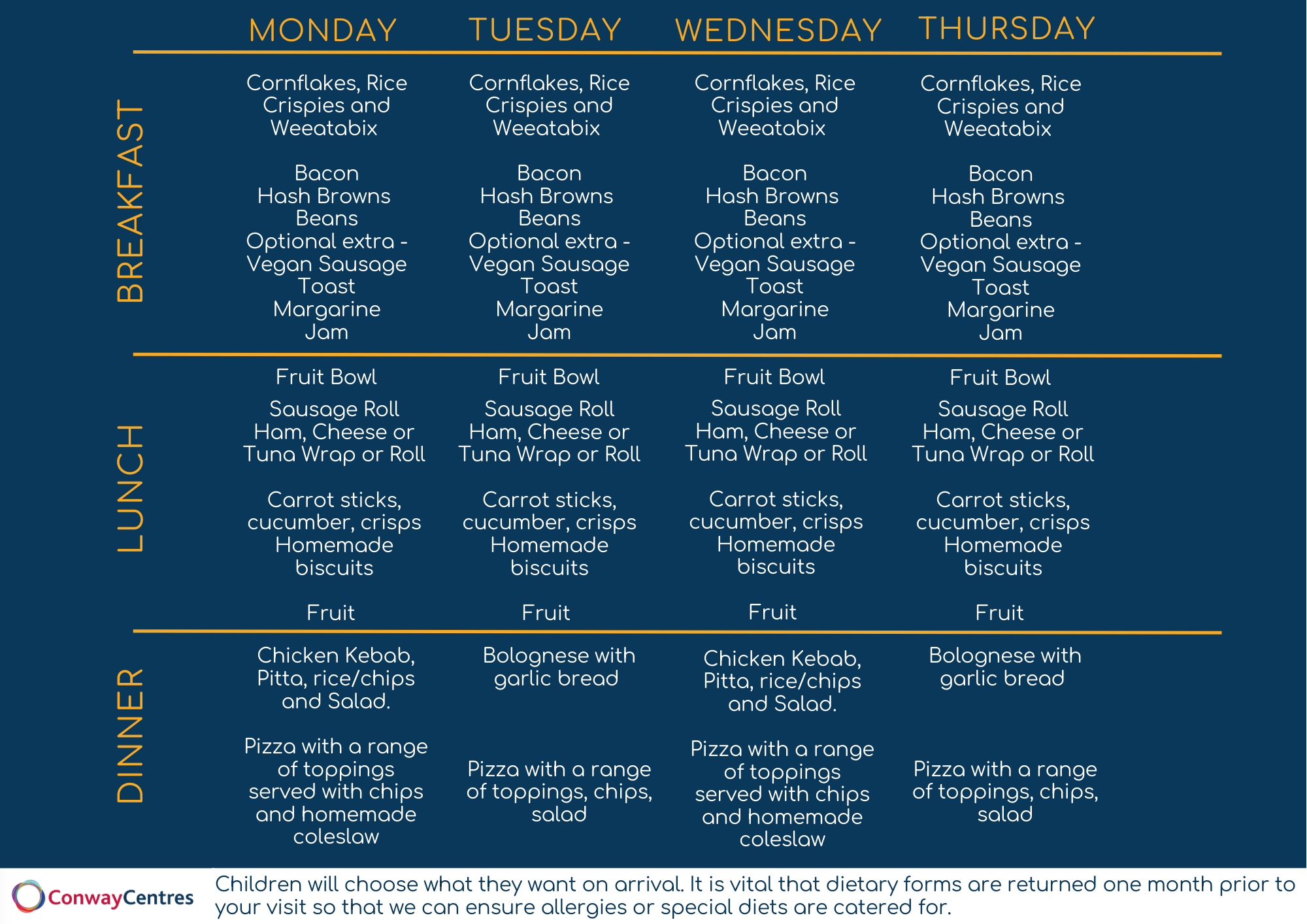 Our centres offer delicious, balanced menus designed to keep your group energised throughout your stay. We provide a variety of meal options to suit all tastes, and dietary requirements or allergies can be fully catered for with advance notice.